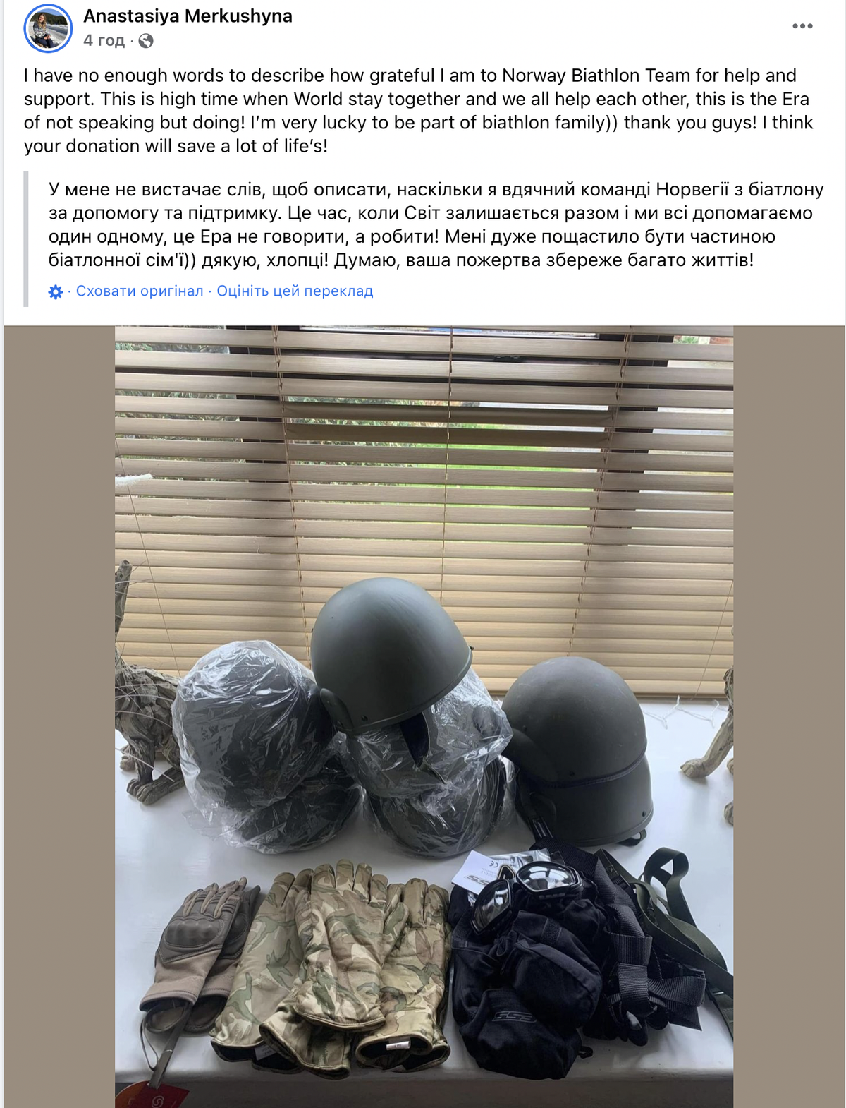 "У мене не вистачить слів, щоб описати, як я вдячна збірній Норвегії з біатлону за допомогу та підтримку. Настав час, коли світ об’єднується разом і ми всі допомагаємо один одному. Це ера не говорити, а робити.