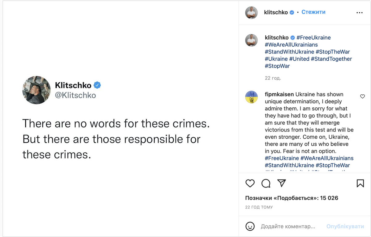 "Немає слів, щоб описати ці злочини. Але є ті, хто відповідає за них", – написав Володимир Кличко на своїй сторінці у соціальній мережі Instagram.