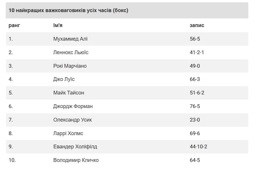 Очолив рейтинг легендарний Мухаммед Алі. Слідом за ним розташувався ще один культовий боксер Леннокс Льюїс. Трійку лідерів замкнув Рокі Марчіано.