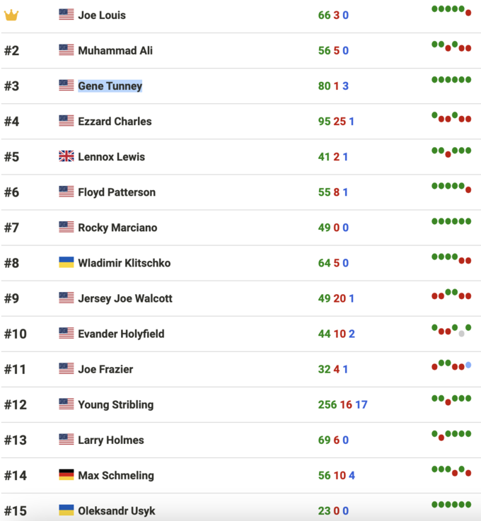 Культовий хевівейтер Мохамед Алі посів друге місце, а третє – Джин Танні. Леннокс Льюїс розташувався на п'ятій позиції.