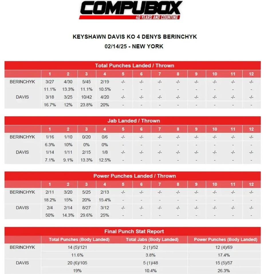 Портал CompuBox опублікував статистику ударів титульного бою. За 4 раунди Берінчик встиг викинути 121 удар – лише 14 з них влучили у ціль. Таким чином Денис продемонстрував 11,6% точності. У активі 36-річного українця 2/52 джеби та 12/69 силових ударів.
