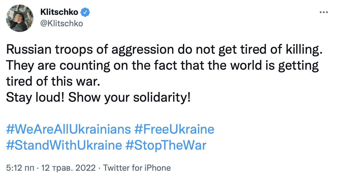 "Російські військові не втомлюются вбивати. Вони розраховують на те, що світ втомився від цієї війни. Залишайтеся голосними. Проявіть солідарність", – написав Кличко у Twitter.