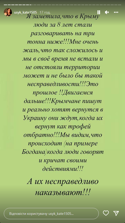 Кримчани пишуть і дійсно хочуть повернутися в Україну. Вони чекають, коли їх повернуть як трофей назад. Ми бачимо, що відбувається, коли люди говорять і кричать своїми діями – їх несправедливо карають", – написала Катерина у своєму Instagram.