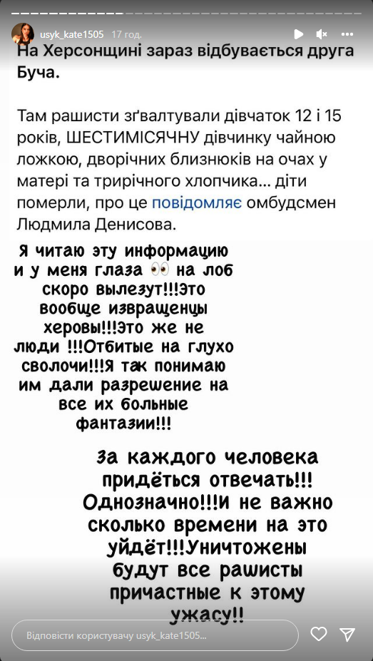 За кожну людину доведеться відповідати. Однозначно. І не важливо, скільки на це часу піде. Усіх рашистів, причетних до цього жахіття, знищать", – написала Катерина Усик у своєму Instagram.
