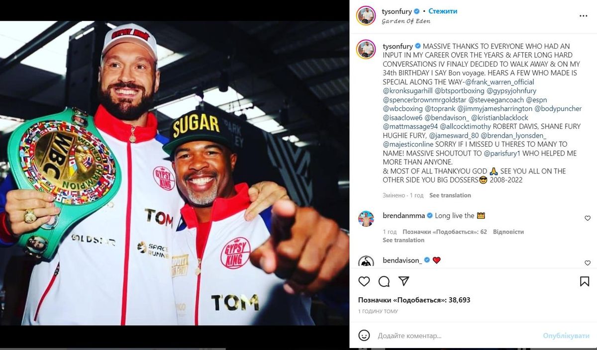 І в день свого народження я кажу: "Bon voyage (гарної подорожі – ред. прим. Спорт 24)". Дуже дякую всім, особливо дружині Періс, яка допомагала мені більше, ніж хто-небудь інший", – написав Ф'юрі у своєму Instagram.