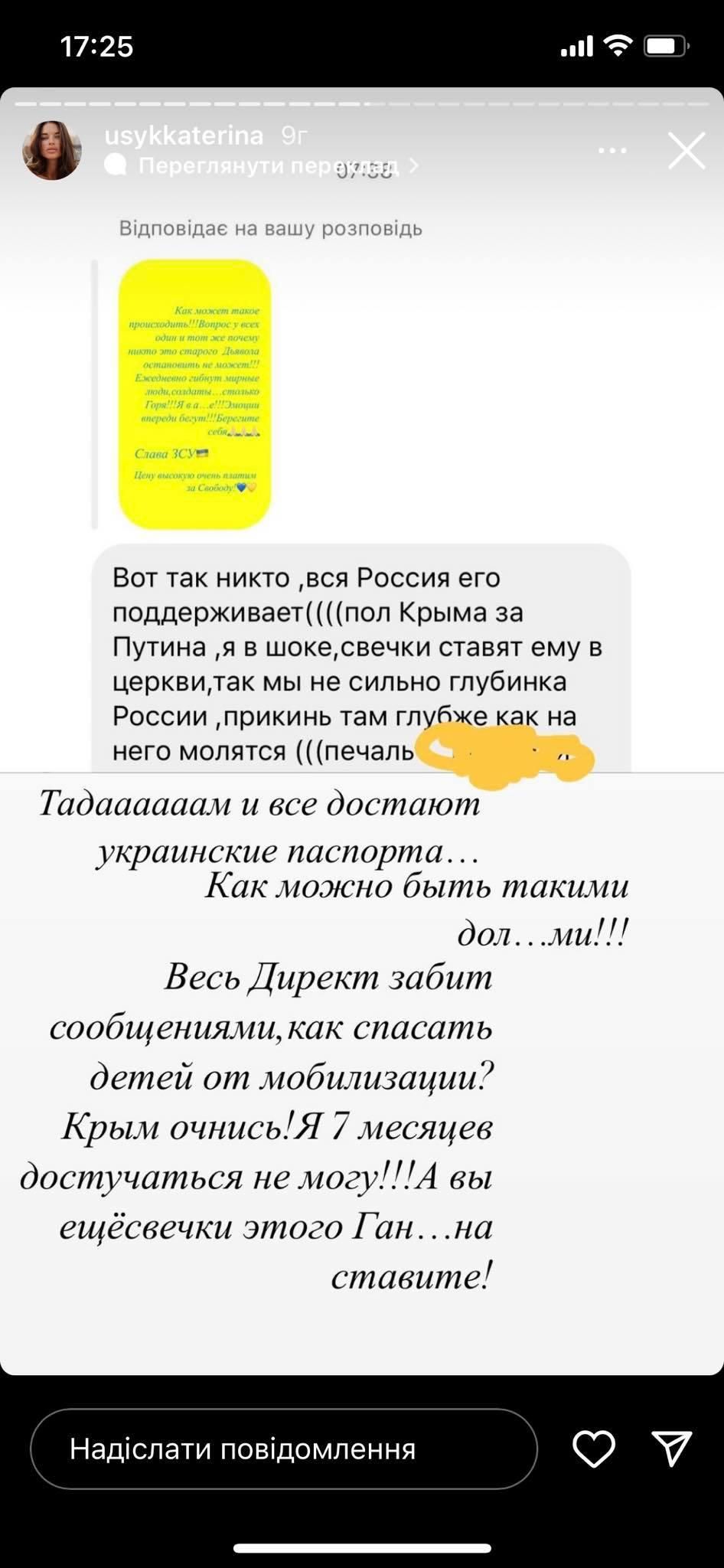"Тадаааам і всі дістають українські паспорти. Як можна бути такими довб..ми!!! Весь дірект забитий повідомленнями, як рятувати дітей від мобілізації?