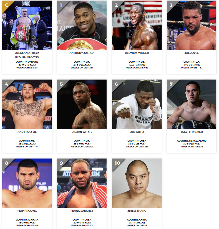 Олександр Усик очолив список, оскільки він є володарем титулу The Ring. На першому місці розташувався жертва українця Ентоні Джошуа. Можливий наступний суперник нашого чемпіона Деонтей Вайлдер замкнув трійку лідерів. Цікаво, що Тайсон Ф'юрі взагалі не потрапив у рейтинг попри те, що був минулим володарем паска від The Ring.