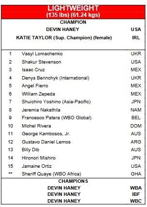 На вершині легкого дивізіону залишився Василь Ломаченко. Нагадаємо, зараз він веде перемовини про бій із Девіном Хейні, який володіє і чемпіонським поясом WBO, і усіма іншими титулами легкої ваги.