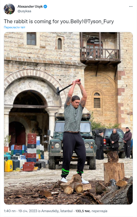 Усик опублікував фото, де він рубає дрова з геолокацією в турецькому Стамбулі на своїй сторінці у Twitter.