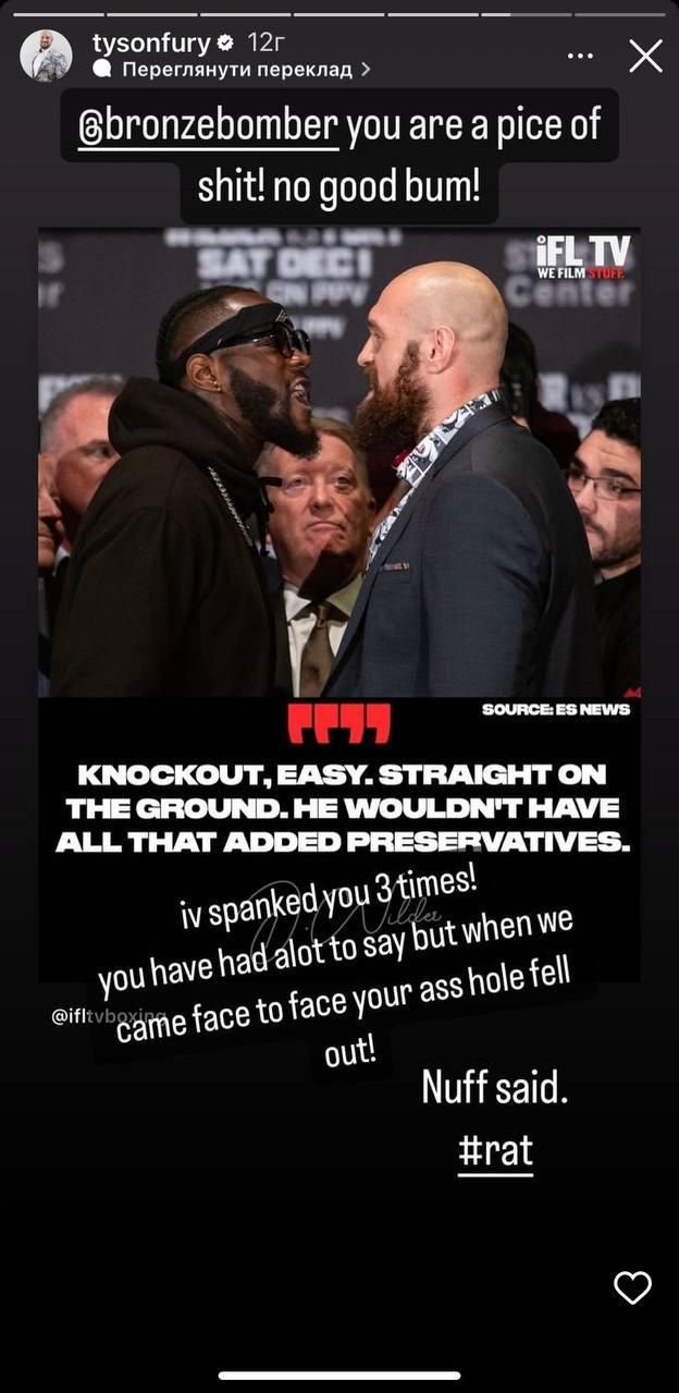 Сам Ф'юрі не міг залишитись осторонь самовпевненого прогнозу й у своєму Insagram відповів: "Вайлдер, ти шматок лайна. Недобрий бомж. Я відшльопав тебе тричі. Тобі було багато чого сказати, але коли ми зіткнулися віч-на-віч ти обісрався".