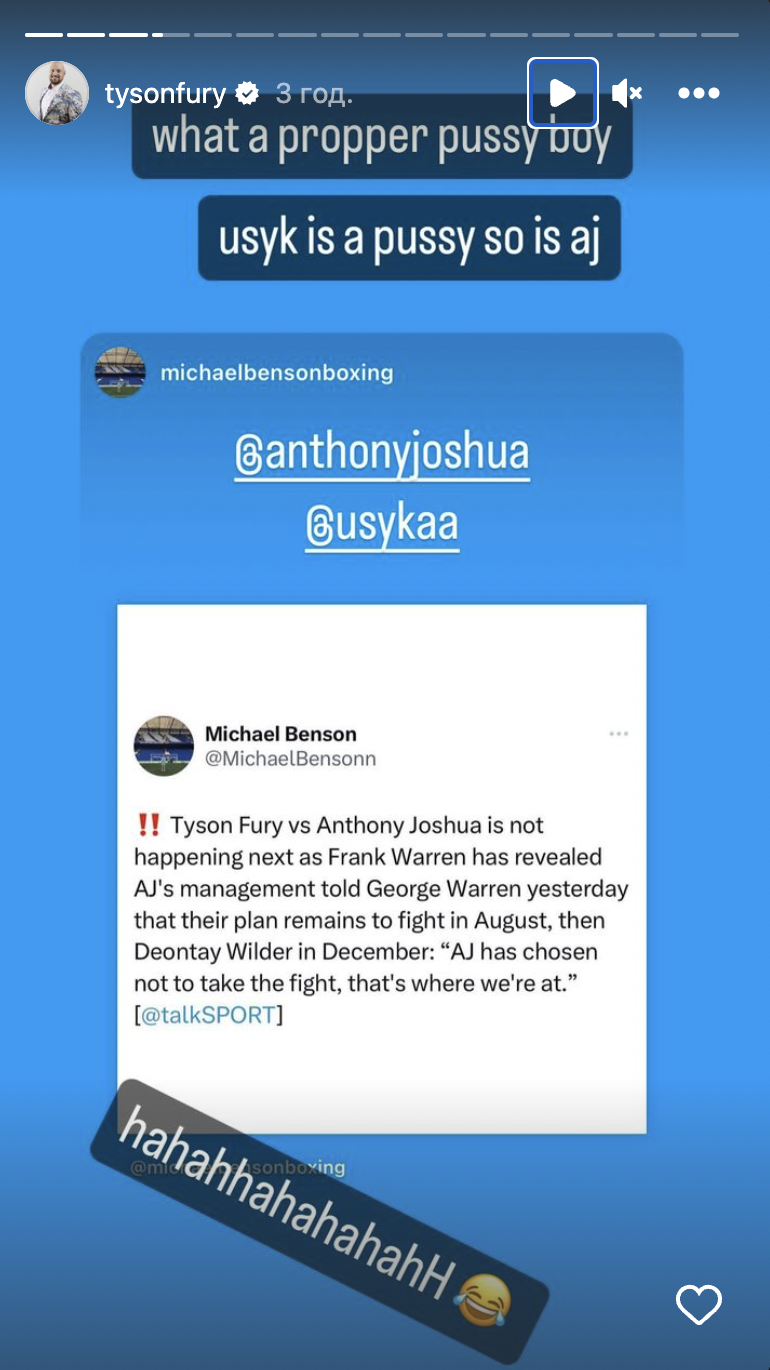 "Що за справжній боягуз! Джошуа такий же боягуз, як і Усик. Ха-ха-ха", – написав Ф’юрі на своїй сторінці в Instagram.