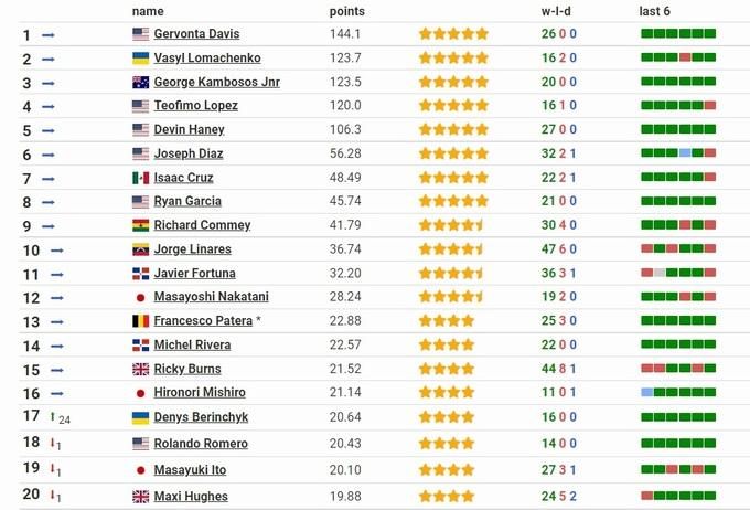 На другій сходинці тут інший українець, ексчемпіон світу Василь Ломаченко. Лідирує непереможний поки американець Джервонта Девіс.