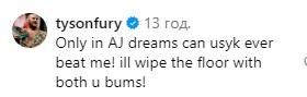 "Тільки в мріях ЕйДжея Усик зможе мене перемогти. Я витру підлогу обома бомжами", – написав Ф'юрі.