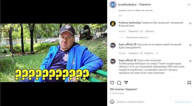 "Су*а, що ж ти за га*дон такий кончений! Ху*ло безхребетне. Спорт "внє палітікі". Ти, Вітю, взагалі йо*нувся на голову? Тисячі людей наших гинуть!!! А ти за спортсменів переживаєш. Моя тобі порада – пи*дуй за кораблем і не вертайся ніколи! І Луческу прихопи, він також спорт "внє палітікі", – написав Кополовлець у коментарях Брутального футболу.
