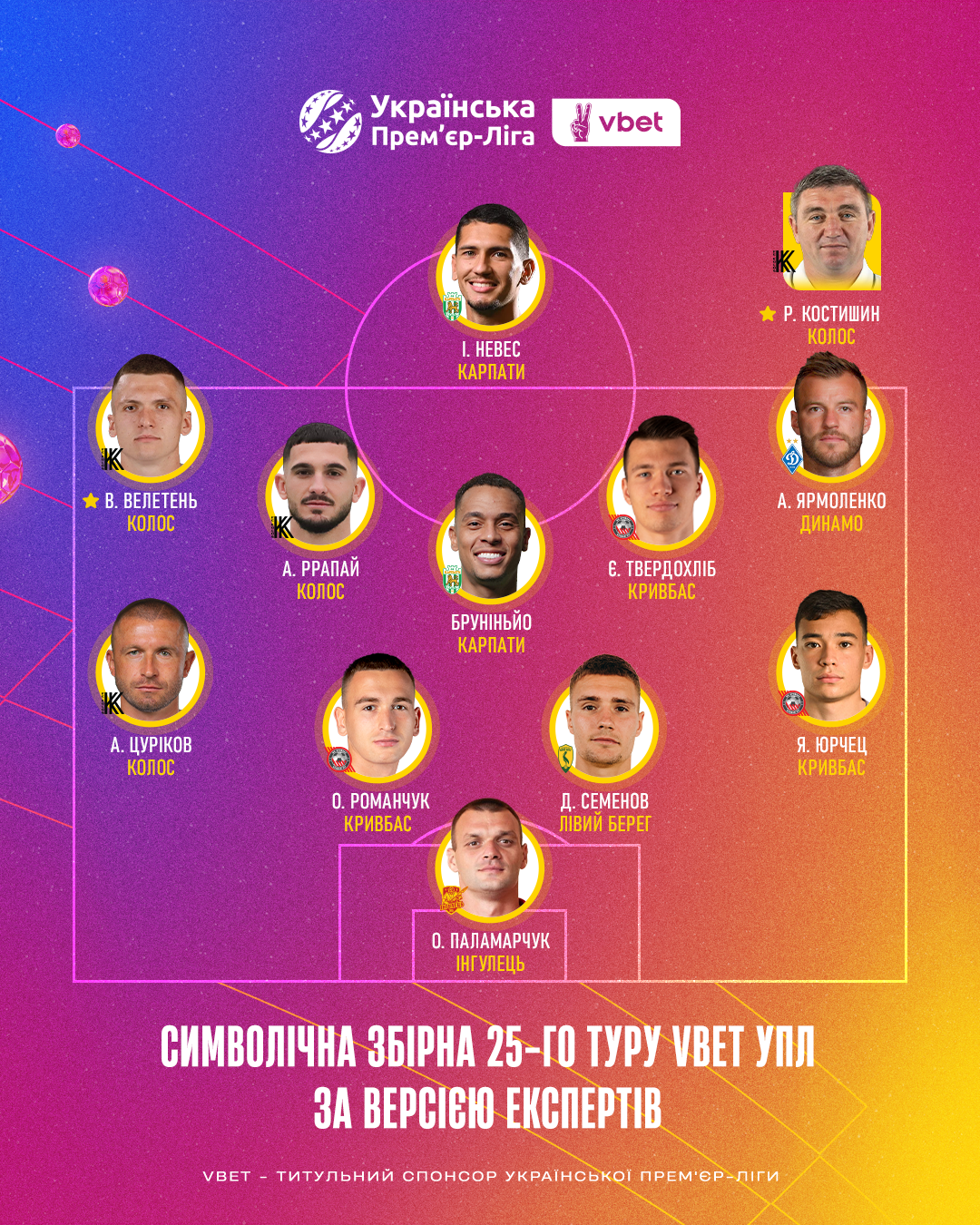 Українська Прем'єр-ліга визначилась з символічною збірною, а також назвала найкращого гравця і тренера 25-го туру УПЛ. У голосуванні брали участь експерти, коментатори УПЛ-ТБ та представники провідних спортивних ЗМІ України.