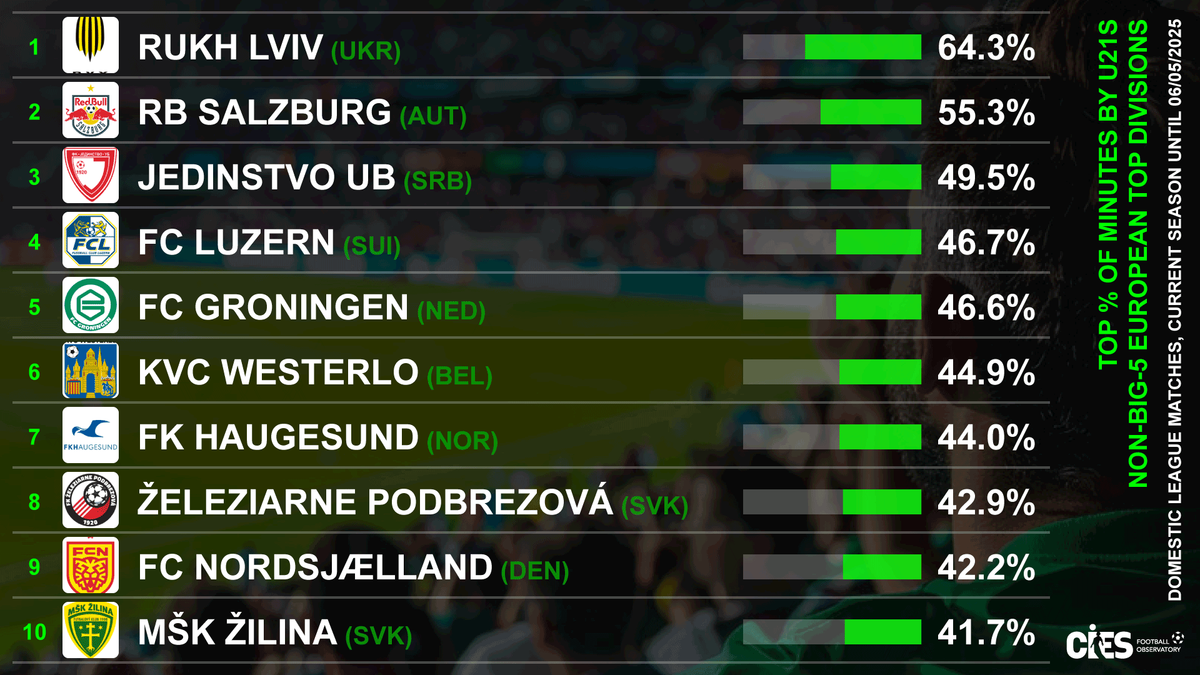 Йдеться про список клубів з-поза топ-5 ліг за кількістю часу, який отримують футболісти віком до 21 року у поточному сезоні.