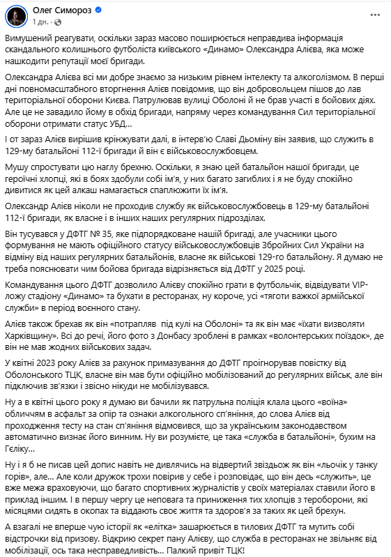 "Маю відреагувати, оскільки зараз масово поширюється неправдива інформація скандального екс-футболіста київського Динамо Олександра Алієва, яка може нашкодити репутації моєї бригади..