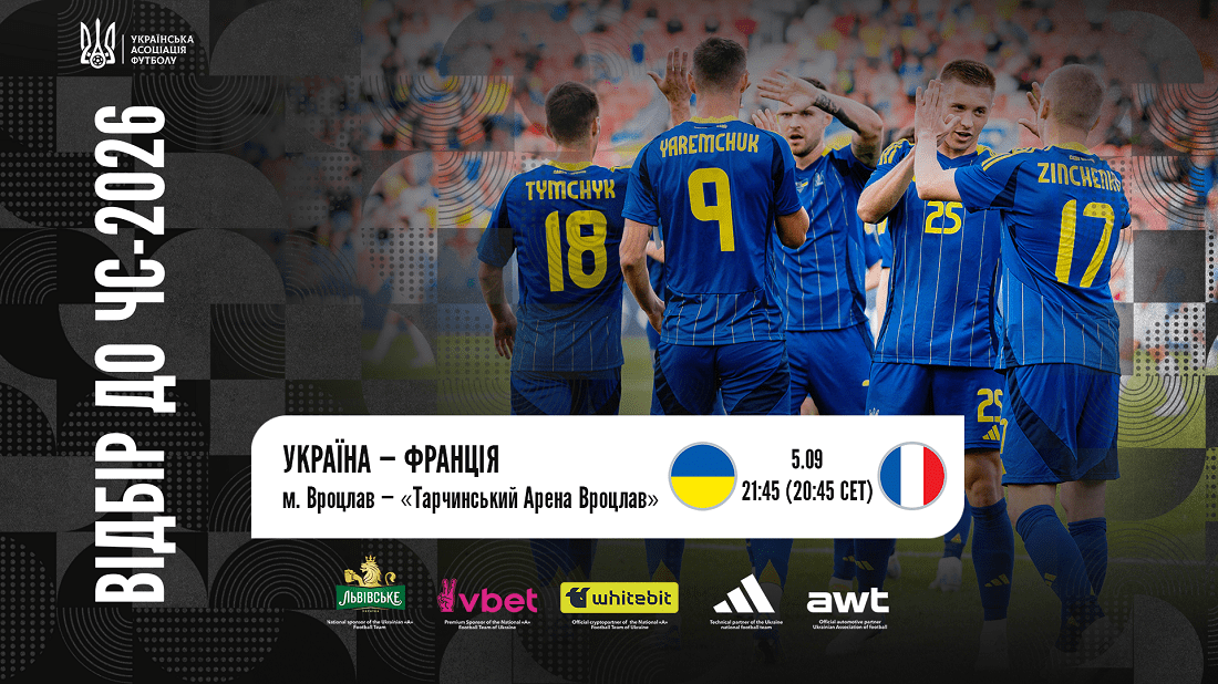 Збірна України свій шлях на чемпіонат світу 2026 року розпочне матчем проти Франції. Поєдинок, який заплановано на 5 вересня, відбудеться у Польщі на Тарчинський Арена у Вроцлаві, повідомляє офіційний сайт УАФ.