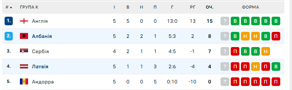 Албанія у паралельному матчі здолала Латвію й вийшла на друге місце в турнірній таблиці групи К, обігнавши сербів. Англія йде на першій сходинці.