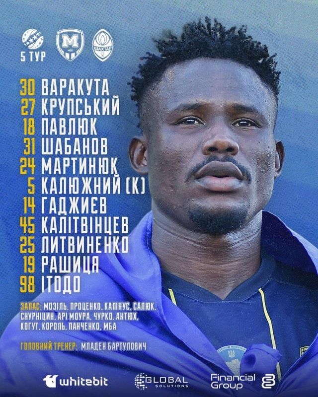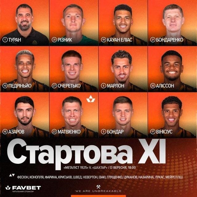 Стартовий склад Шахтаря: Різник – Вінісіус Тобіас, Бондар, Матвієнко, Азаров – Очеретько – Аліссон, Бондаренко, Марлон, Педрінью – Еліас