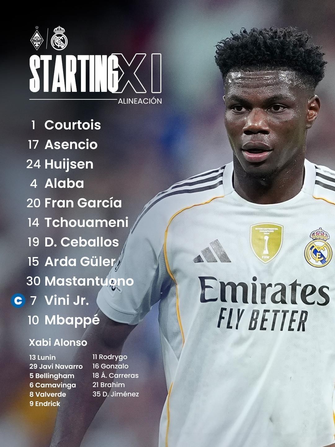 Стартовий склад Реала: Куртуа – Асенсіо, Хьойсен, Алаба, Фран Гарсія – Чуамені, Себальос, Гюлер – Вінісіус, Мбаппе, Мастантуоно