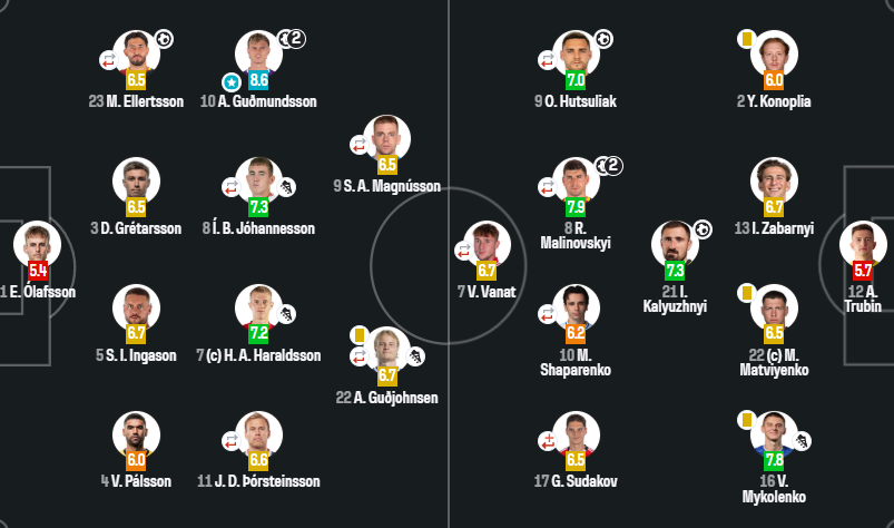 За версією SofaScore, гравцем матчу став ісландський хавбек Гудмундссон, який відзначився двома голами (8,6). Найкращим з українців став Руслан Маліновський (7,9), також високо оцінили гру Віталія Миколенка (7,8) та Назара Волошина (7,2).