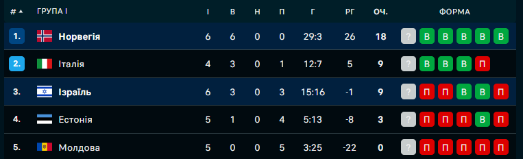 Норвегія з 18 очками очолює групу I та випереджає Італію й Ізраїль на 9 балів. Але у 4-разових чемпіонів світу 2 гри в запасі.