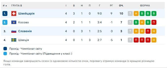 Попри втрату очок, Швейцарія залишається на першому місці в групі В (10 залікових балів), Косово йде зразу за нею (7 пунктів).