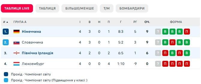 В іншому матчі цієї групи Словаччина вдома обіграла Люксембург. Перший тайм минув без голів, але на старті другого господарі повели у рахунку. А трохи згодом Шранц подвоїв перевагу своєї команди. Після 4 турів Німеччина з 9 очками очолює квартет А, Словаччина з такою ж кількістю пунктів іде другою.