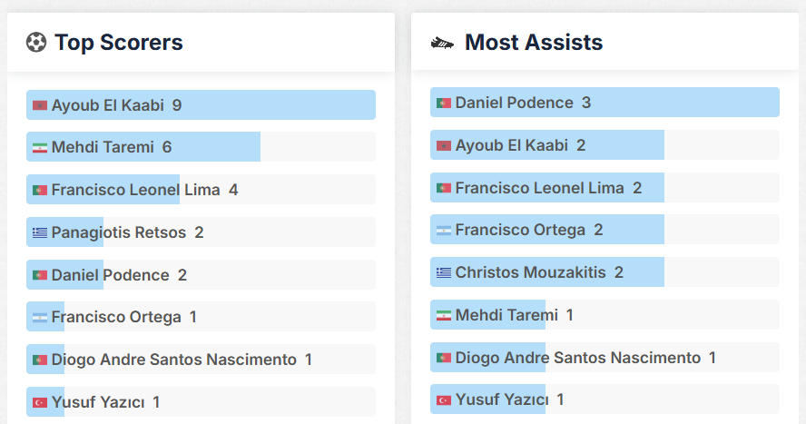 У Олімпіакосі вражає результативністю дует конкурентів Романа Яремчука. Аюб Ель Каабі та орендований з Інтера Мегді Таремі на двох забили вже 15 голів. Найбільше асистів роздає екс-одноклубник Георгія Бущана в Аль-Шабабі Даніель Поденсе, якого повернули на цей сезон з Саудівської Аравії.