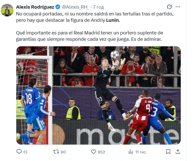 "Він не буде на обкладинках газет, його ім'я не згадуватимуть у післяматчевих ток-шоу, але варто відзначити постать Андрія Луніна. Як важливо для Реала мати надійного запасного воротаря, який завжди виправдовує очікування, коли виходить на поле. Це гідно поваги", – пише Алексіс Родрігес з Defensa Central.