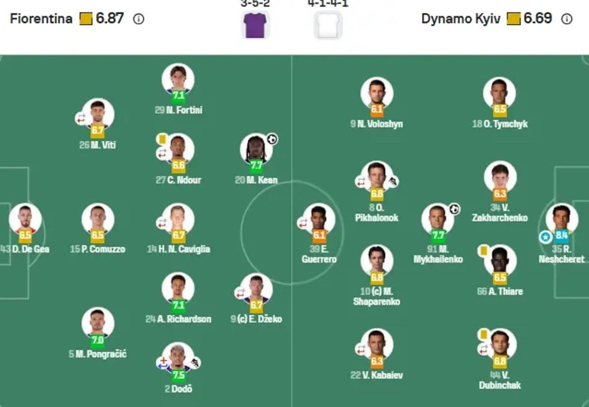 А от найнижчі оцінки в Едуардо Герреро і Назара Волошина – по 6,1 бала. У складі Фіорентини найвищий показник у автора першого голу Мойзе Кіна – 7,7.