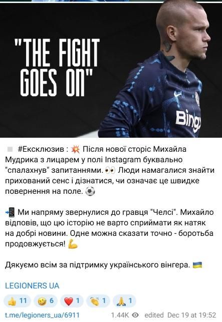 Однак автори Telegram-каналу LEGIONERS.UA трохи пролили світло на ситуацію. "Ми напряму звернулися до гравця Челсі. Михайло відповів, що цю історію не варто сприймати як натяк на добрі новини. Одне можна сказати точно – боротьба продовжується!", – написали вони.