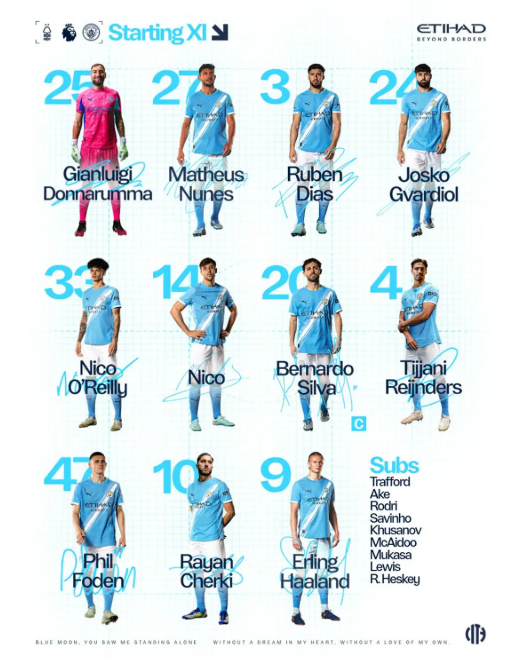 Манчестер Сіті: Доннарумма, Нуньєш, Діаш, Гвардіол, О'Райлі, Ніко, Бернарду (к), Рейндерс, Фоден, Шеркі, Холанд.