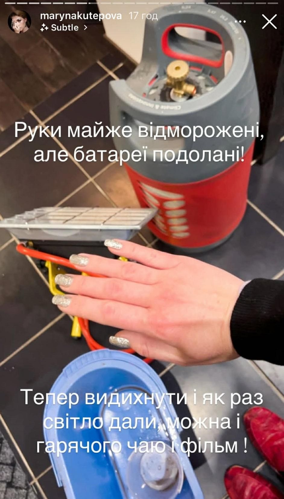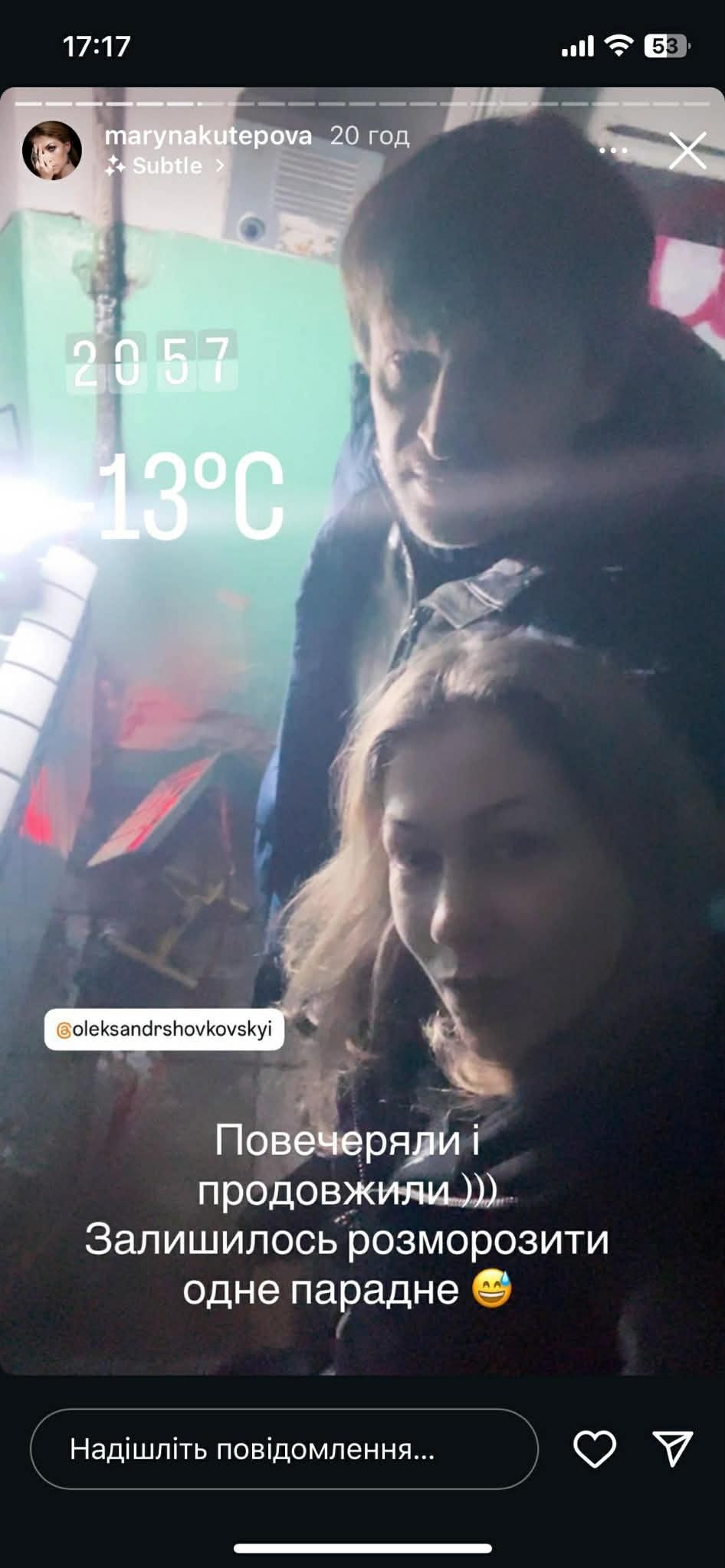 Раніше Марина Кутєпова показувала, як вони з чоловіком і котами гріються у квартирі від домашнього каміна. Тепер дружина Шовковського поділилася зі своїми підписниками в Instagram, що у під'їзді їхнього будинку через тривалу відсутність електропостачання позамерзали труби.