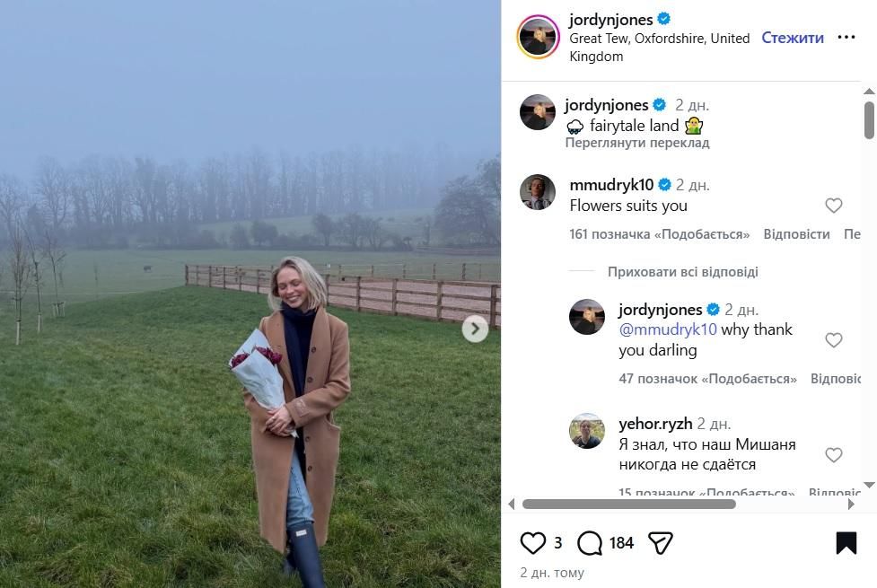 Нещодавно Мудрик привернув увагу фанів у соцмережах, залишивши коментар під фото популярної актриси Джордін Джонс, яка має понад 9 мільйонів підписників у Інстаграмі.