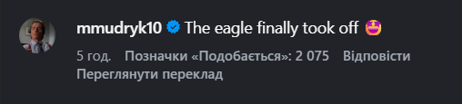 У допису під останньою публікацією Трубіна в Instagram Мудрик залишив короткий коментар.