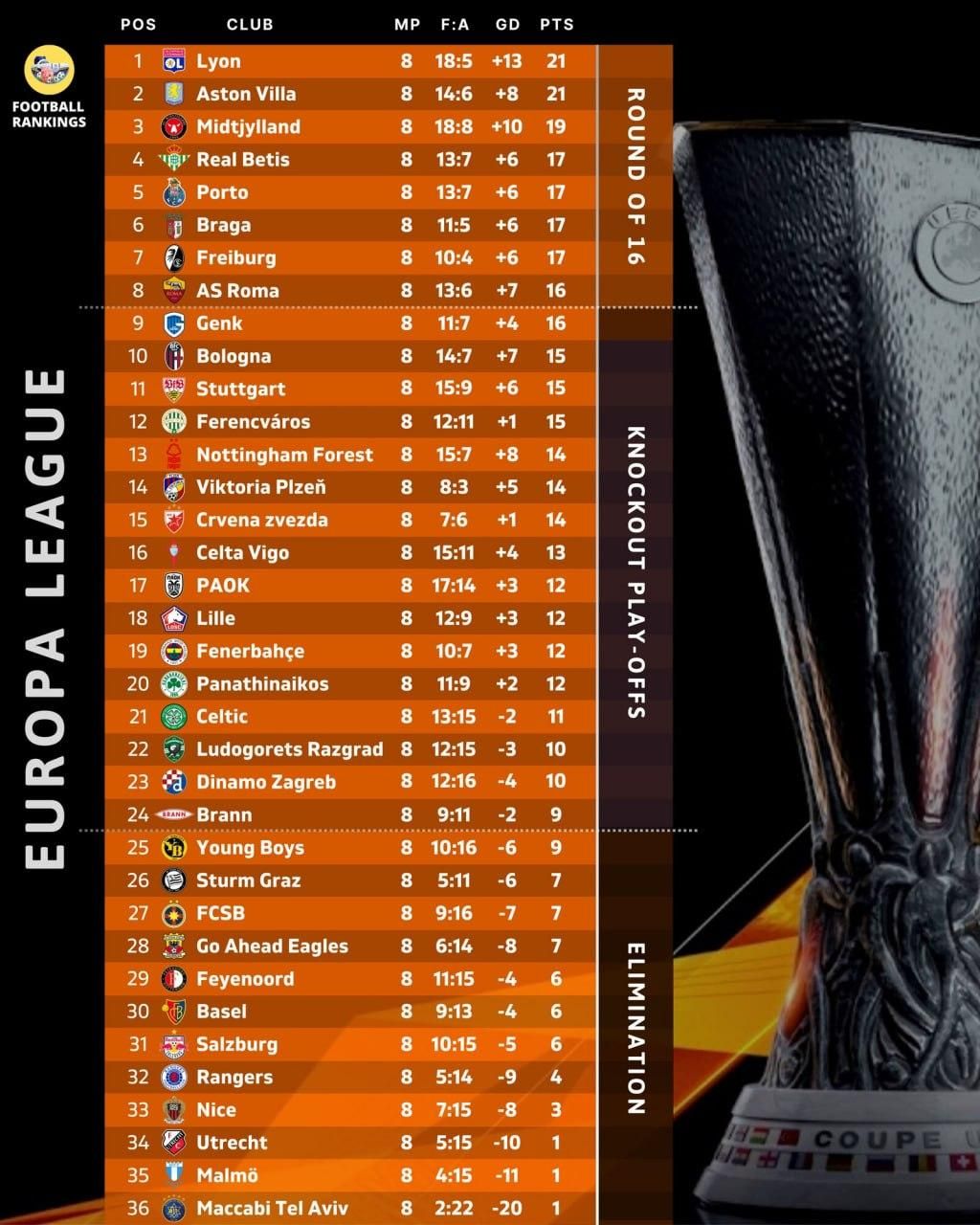 До вісімки найкращих команд другого за рангом єврокубку потрапили Ліон, Астон Вілла, Мідтьюлланд, Бетіс, Порту, Брага, Фрайбург та Рома. Римляни, за яких виступає Артем Довбик, вибороли останню пряму путівку до 1/8 фіналу Ліги Європи.