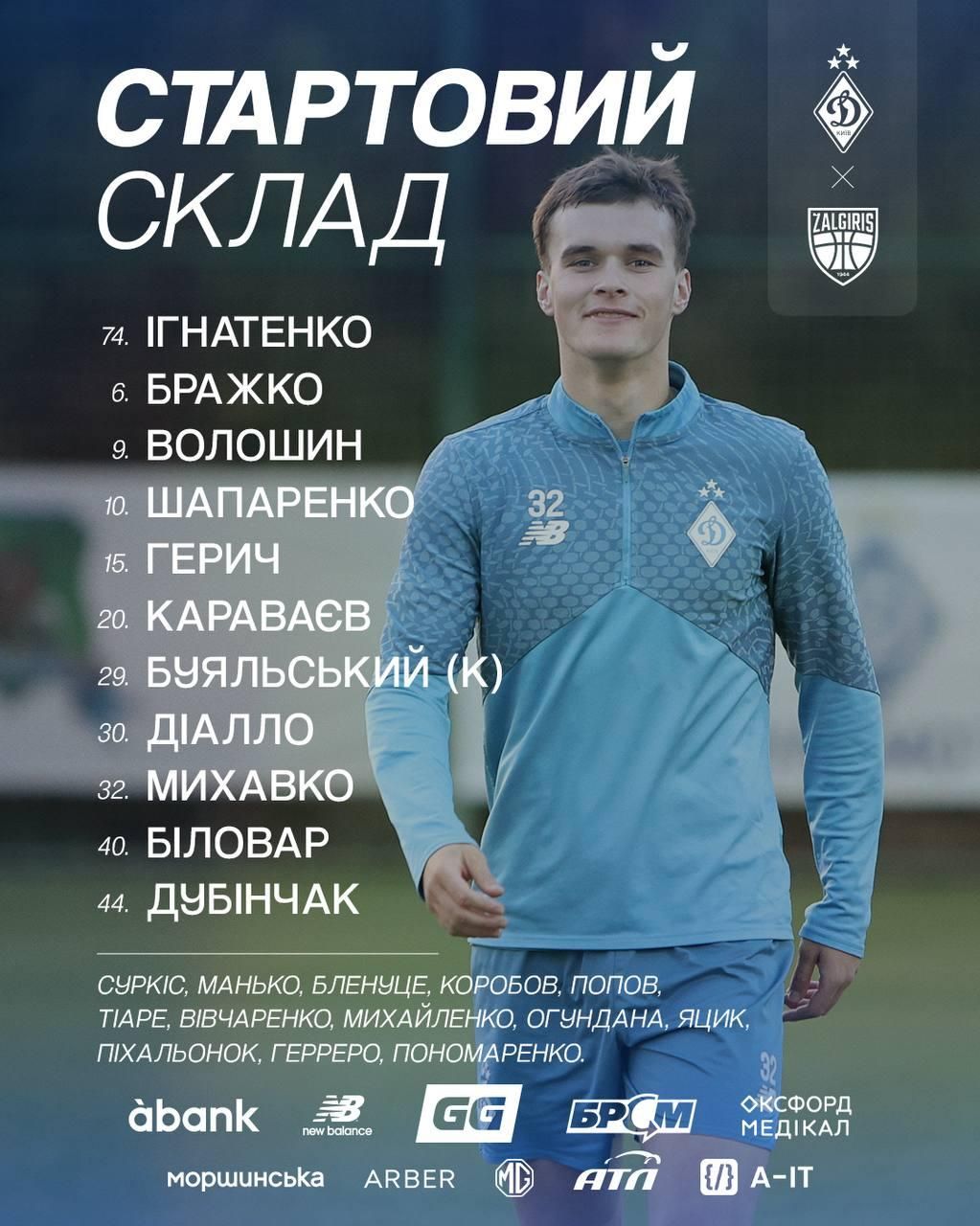 Стартовий склад Динамо: Ігнатенко – Бражко, Волошин, Шапаренко, Герич, Караваєв, Буяльський, Діалло, Михавко, Біловар, Дубінчак.