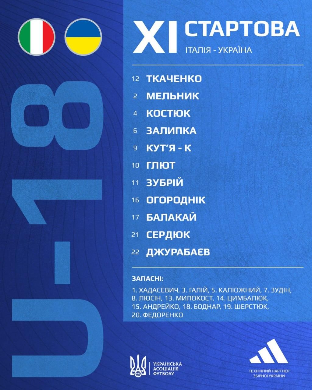 Стартовий склад збірної України: Ткаченко, Мельник, Костюк, Залипка, Кут'я (к), Глют, Зубрій, Огороднік, Балакай, Сердюк, Джурабаєв.