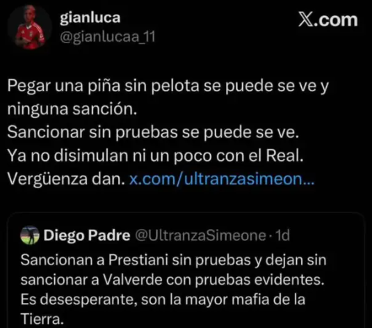 Престіанні продовжує бути в центрі всіх суперечок навколо матчу між "вершковими" та Бенфікою. Аргентинець опублікував скандальний твіт, який згодом видалив, повідомляє Marca. Він відповів на інше повідомлення користувача, коли той згадав про скандальні епізоди з Федеріко Вальверде та натякнув на те, що арбітри завжди стають на бік Реала в сумнівних епізодах.