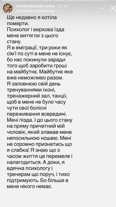 "Ще недавно я хотіла померти. Психолог і верхова їзда витягли мене з цього стану. Я в еміграції. Три роки як сім’ї, по суті, в мене не існує, бо нас покинули заради того, щоб заробити гроші на майбутнє. Майбутнє, яке вже неможливе разом.
