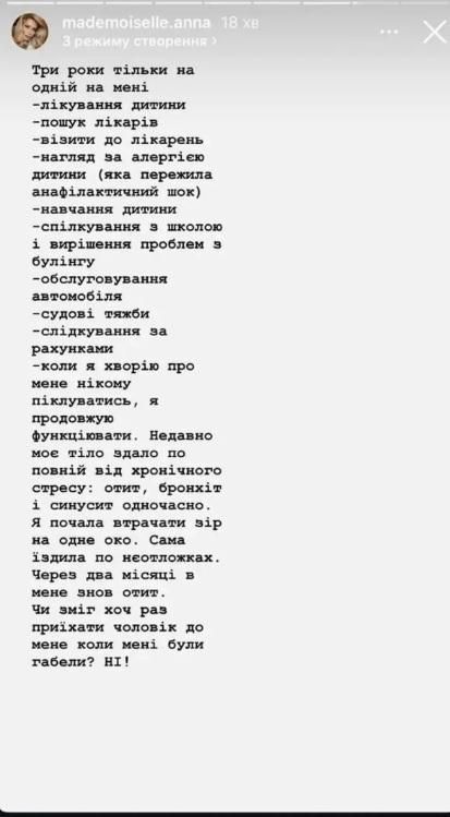 Коли я хворію, про мене нікому піклуватися – я продовжую функціонувати. Нещодавно моє тіло здало повністю від хронічного стресу: отит, бронхіт і синусит одночасно. Я почала втрачати зір на одне око. Сама їздила по невідкладних допомогах. Через два місяці в мене знову отит. Чи зміг хоч раз приїхати чоловік до мене, коли мені було геть погано? Ні", – написала Анна Зубкова у своїх соцмережах.