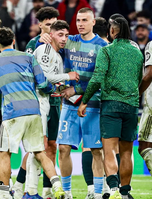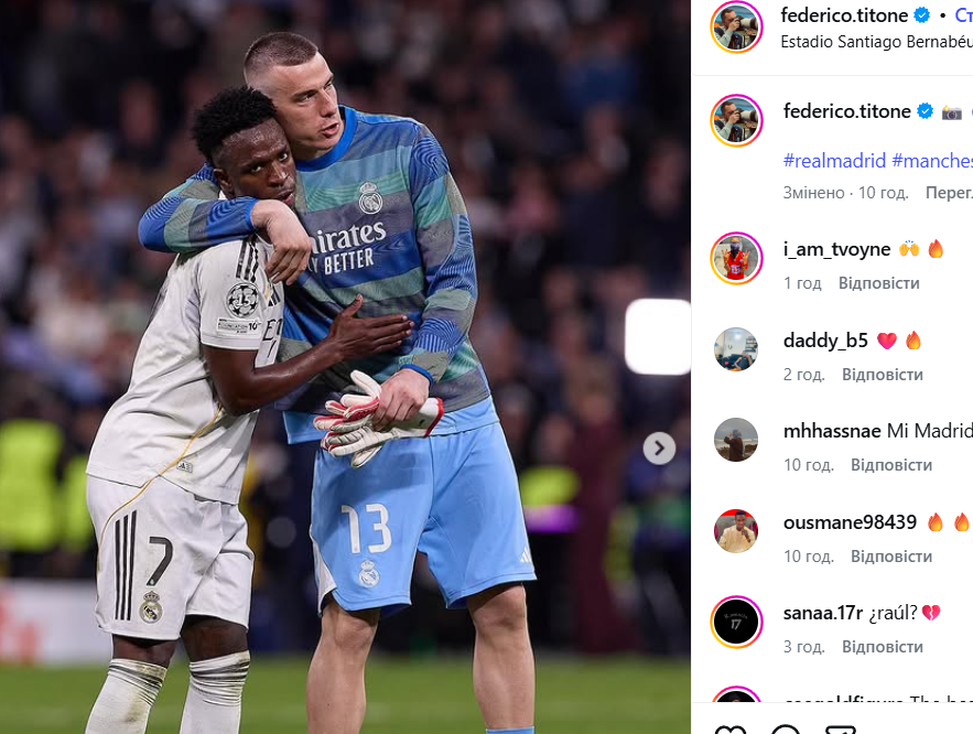 Лунін у матчі участі не брав, але засвітився перед камерами після матчу. Голкіпер обіймав автора хет-трику Феде Вальверде та підтримав Вінісіуса, який не забив пенальті.
