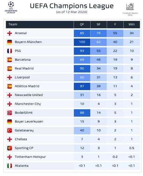 Попри це саме англійський клуб є головним фаворитом на перемогу в ЛЧ за версією Football Meets Data. На тріумф Арсенала дають 34%. Далі йдуть Баварія (21%) та ПСЖ (10%). Ман Сіті майже не має шансів вийти навіть у чвертьфінал – 10%.