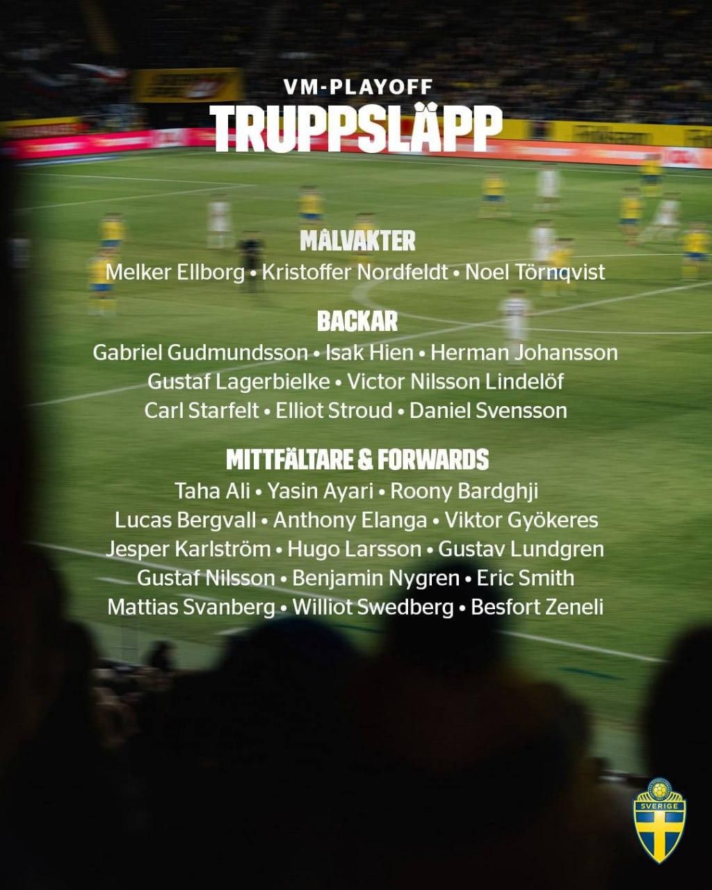 До списку увійшли 26 гравців. Не потрапив у склад суперзірковий нападник Ліверпуля Александр Ісак, який не грав від грудня через травму. Також не зможе зіграти гравець Тоттенхема Деян Кулусевскі.