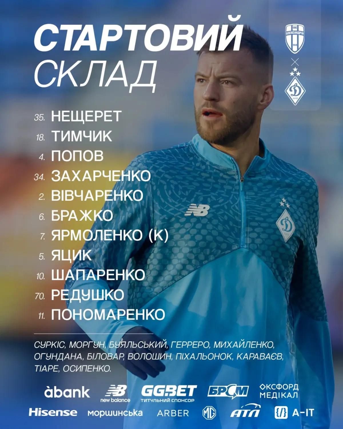 Динамо: Нещерет – Тимчик, Попов, Захарченко, Вівчаренко – Бражко – Ярмоленко (к), Яцик, Шапаренко, Редушко – Пономаренко.