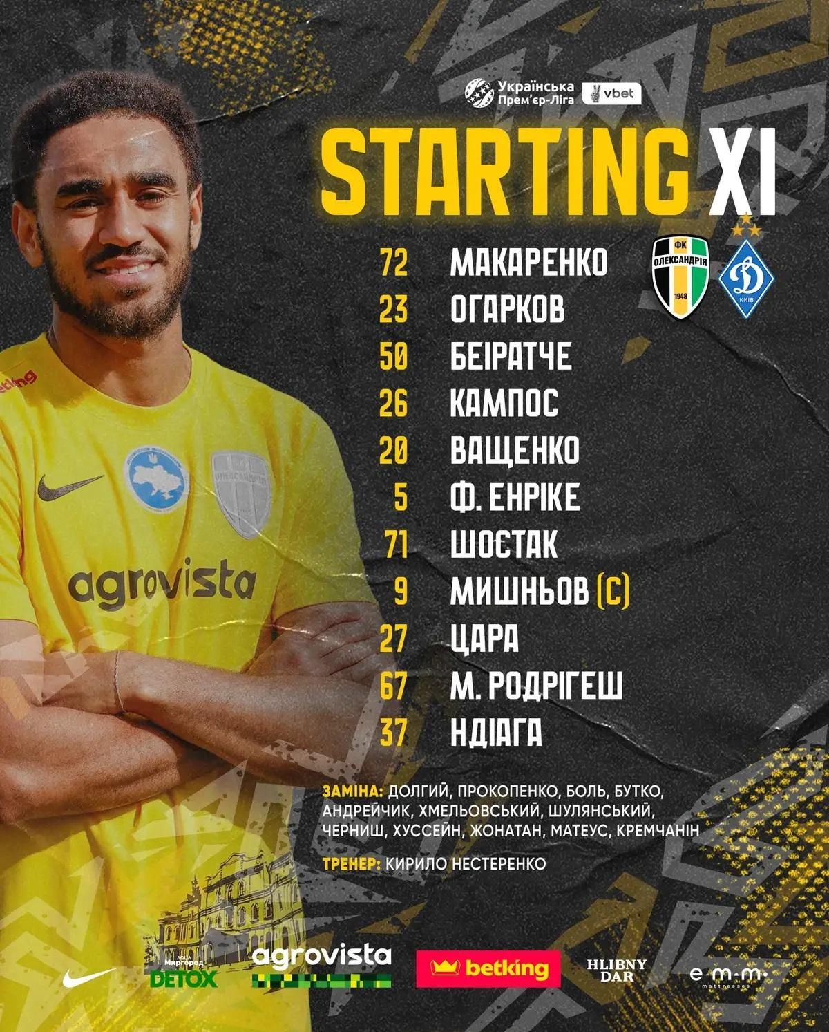 Олександрія: Макаренко – Ващенко, Кампуш, Беіратче, Огарков – Фернандо Енріке – Мауро Родрігеш, Шостак, Мишньов (к), Цара – Яде.