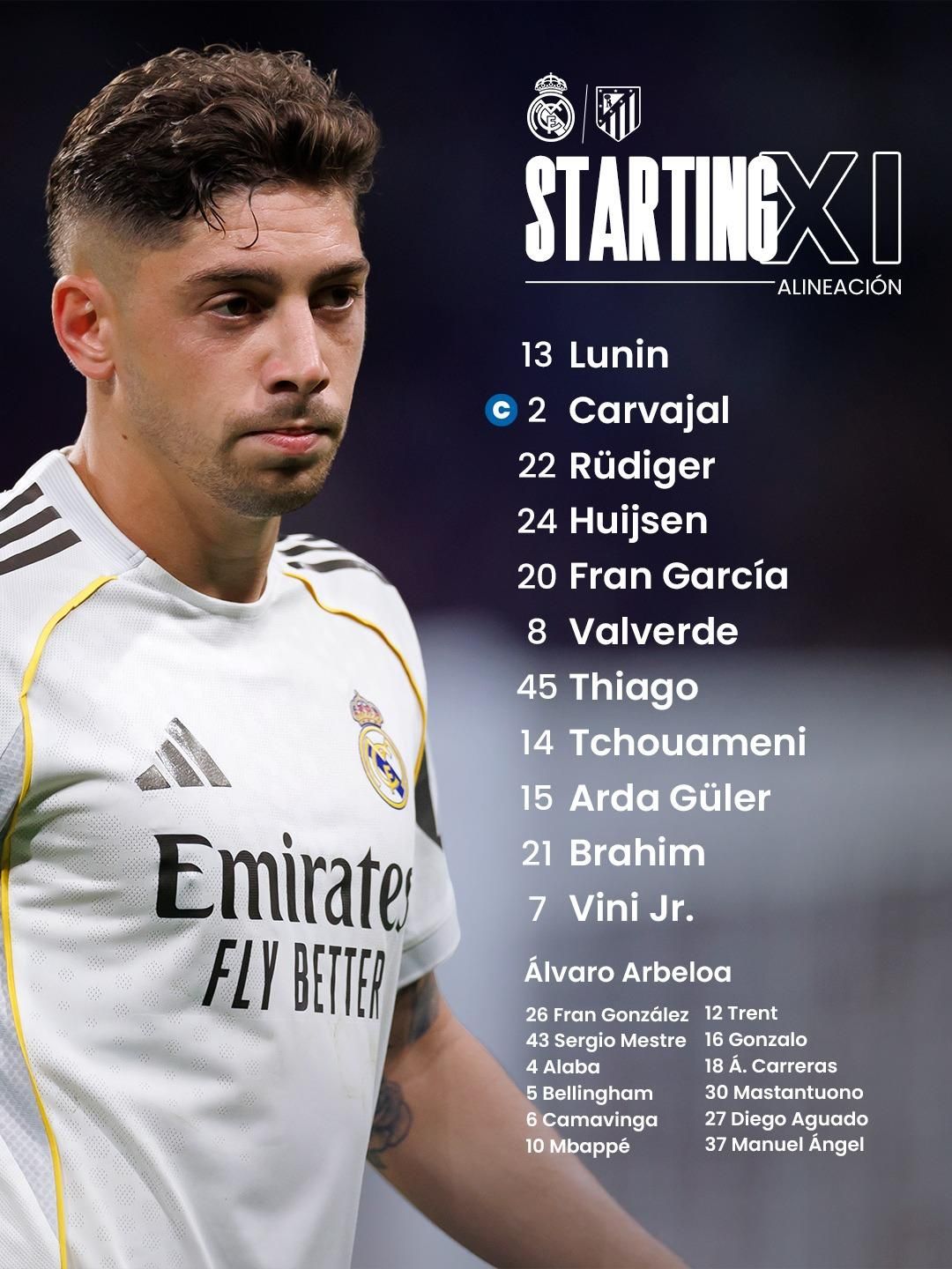 Реал: Лунін – Карвахаль, Рюдігер, Хьойсен, Ф. Гарсія – Вальверде, Чуамені, Пітарч – Гюлер, Вінісіус, Браїм Діас.
