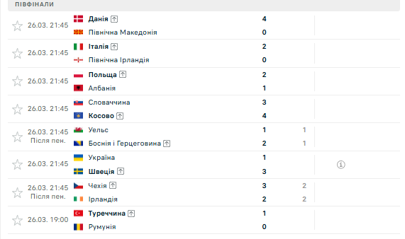 Відбулися дві серії пенальті: Боснія та Герцеговина вибила Уельс, а Чехія пройшла Ірландію. Ще одну путівку в фінал вирвала збірна Косово, перестрілявши Словаччину 4:3.